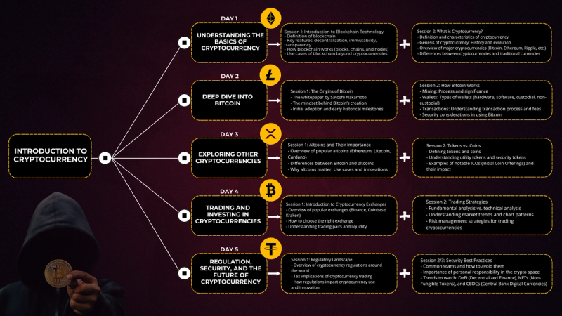 This 6-day bootcamp is designed to provide participants with a comprehensive understanding of cryptocurrency and Bitcoin. Over the course of six days, attendees will explore the fundamentals of blockchain technology, the workings of Bitcoin, various cryptocurrencies, practical trading strategies, regulatory considerations, and potential future trends in the cryptocurrency space.