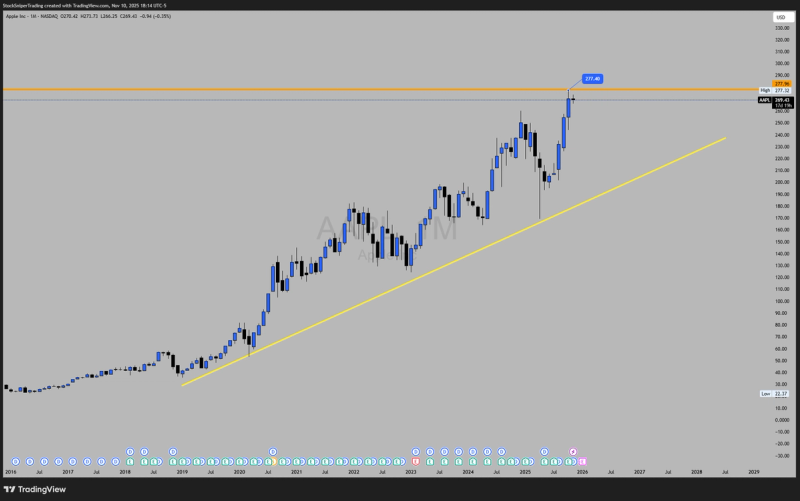 Apple's share price has experienced significant increases over the years, reflecting its strong financial performance and investor sentiment. The share price is influenced by factors like earnings reports, product launches, broader market trends, and economic conditions. Currently, Apple Inc is trading near it's all time high (ATH) at $277 per share.