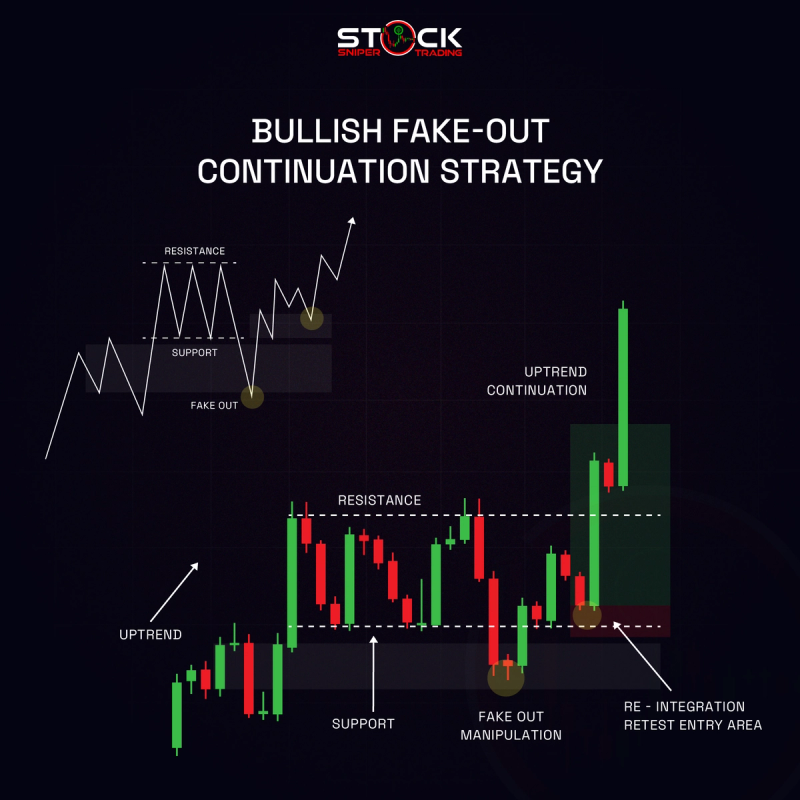 The bullish fake-out continuation strategy is a trading approach used to capitalize on a situation where the market appears to break out below a support level, only to quickly reverse and continue in the opposite direction (typically upwards). This strategy is based on identifying false breakouts, which can often trap traders anticipating a new trend direction, but instead result in a continuation of the previous trend.