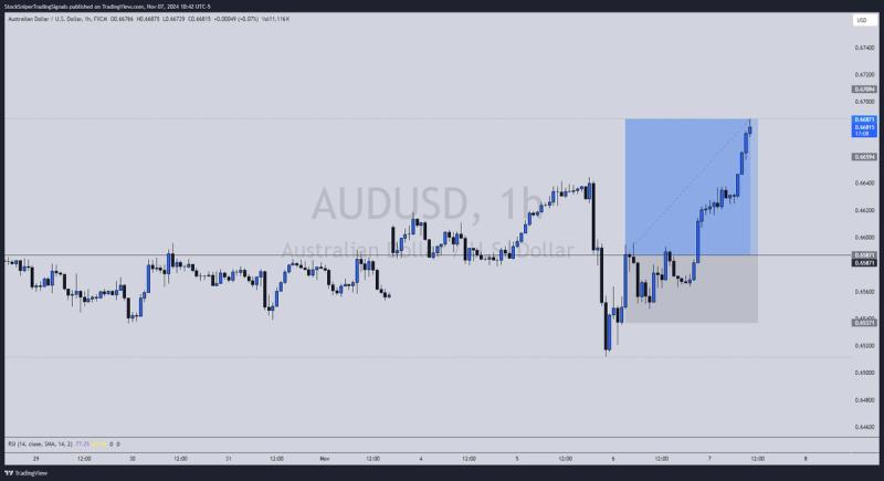 Our trade idea on the AUD/USD pair was based on a clear uptrend visible on the hourly timeframe. The pair experienced a strong rally, reaching our target of 100 pips. This movement confirmed the strength of the underlying trend, offering retracement or pullback opportunities for additional entries.