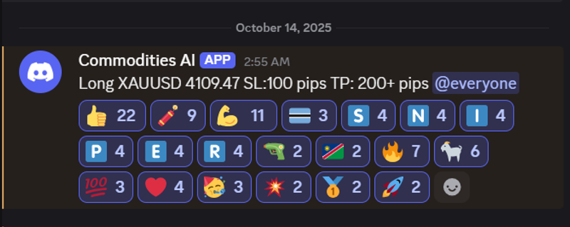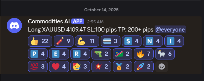 On October 14, 2025, at 2:55 AM (likely UTC or EST, aligning with early Asian session momentum), the Commodities AI App issued a Scalper Pro long trade alert for XAUUSD (Gold Spot vs. USD) at an entry price of 4109.47. This setup featured a tight stop-loss (SL) of 100 pips below entry (at 4099.47) and a take-profit (TP) target of 200+ pips above (initially eyeing 4309.47+). As evidenced by the attached Discord screenshot and the post-trade chart from TradingView (showing a 5-minute candlestick replay from October 14, 06:00 UTC), the trade executed flawlessly: price dipped briefly post-entry but rebounded strongly, breaking out of a blue-highlighted consolidation box near 4100, surging through resistance at ~4124.70 (the day's high), and ultimately hitting full TP amid a broader uptrend that pushed gold to a record $4,142.95 intraday. This 200+ pip win (approximately 2% account gain on a standard 1% risk position) exemplifies Scalper Pro's edge in volatile commodities trading, capturing safe-haven flows driven by lingering U.S. government shutdown uncertainty (now in week two) and dovish Fed echoes from Powell's recent speech. With 22 thumbs-up reactions and high engagement on Discord, it reinforced community trust—let's dissect why this was sent, how risk was managed, and its blueprint for future trades.