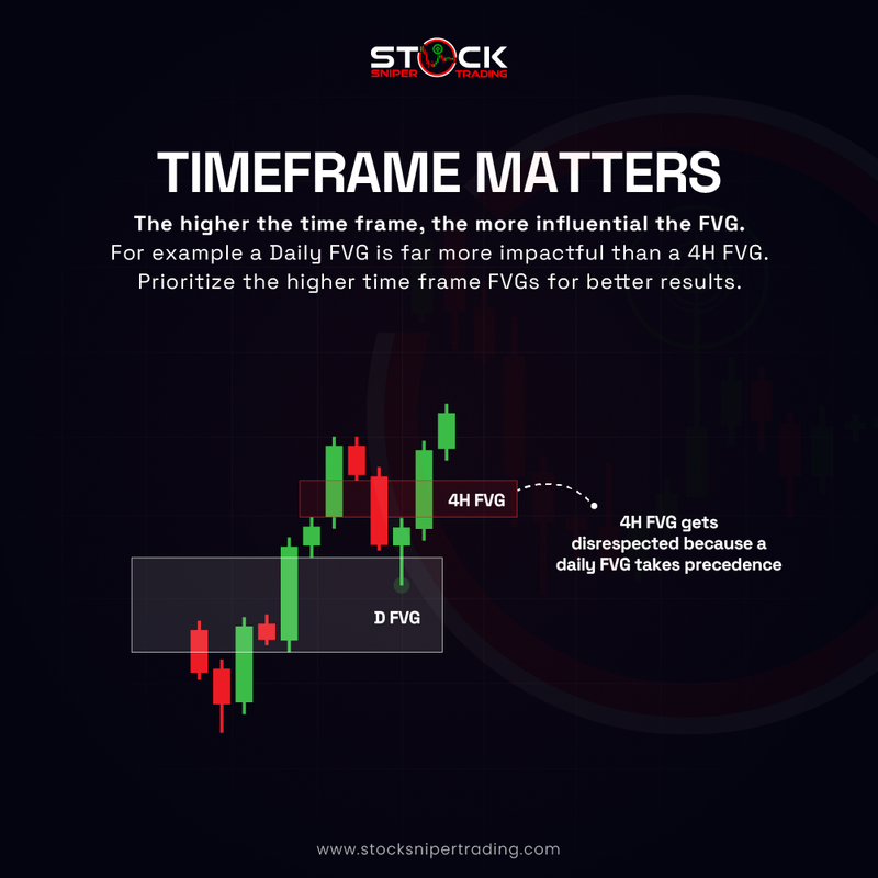 Timeframes significantly impact the reliability of FVGs. Higher timeframes carry more weight than lower ones due to larger trading volumes.