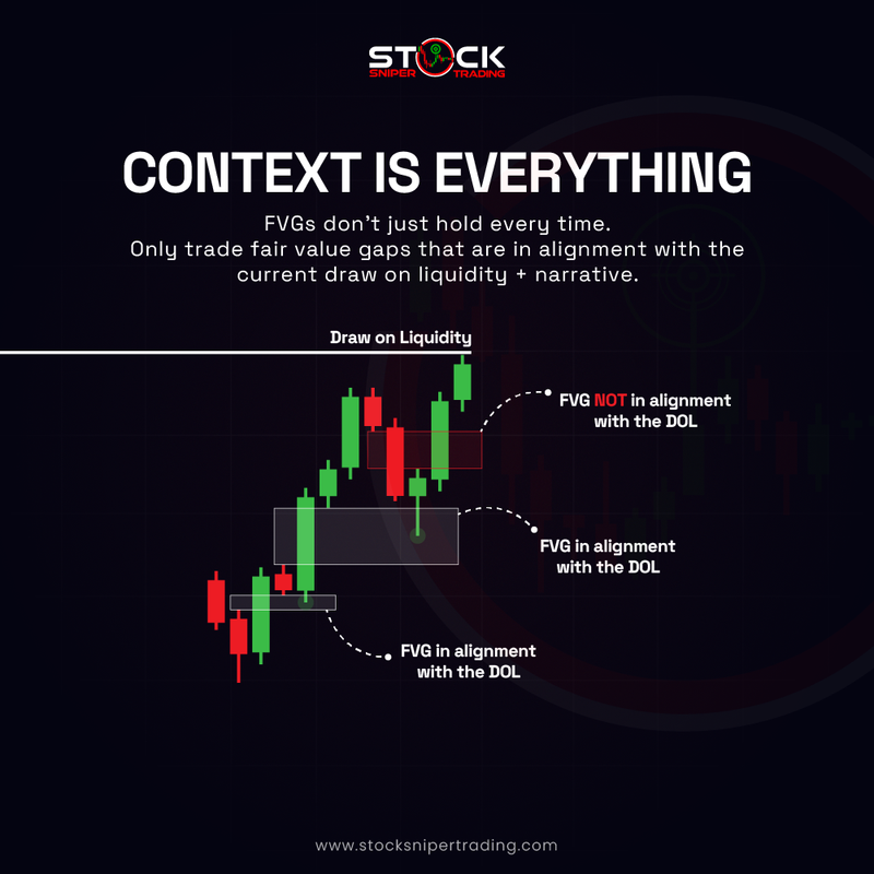 Not all FVGs are created equal; context is essential. FVGs will not always hold, particularly if they do not align with the current draw on liquidity and market narrative.